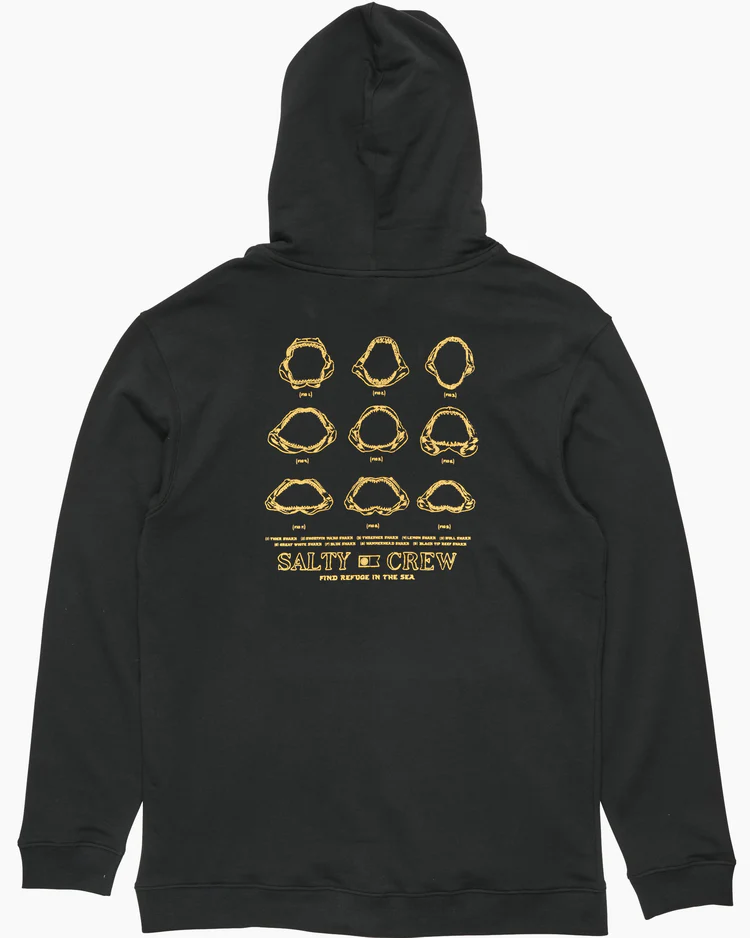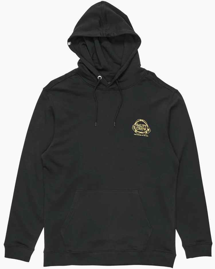The Jawbone Midweight Fleece Hood in Black is made from our signature mid-weight Cotton/Polyester Brushed Fleece, 300gsm in weight. Featuring a two-piece hood with encased drawcord, rib knit cuffs and hem, self-fabric kangaroo pocket, and Salty Crew clamp label at the hood opening. Finished with screen printed front and back prints.