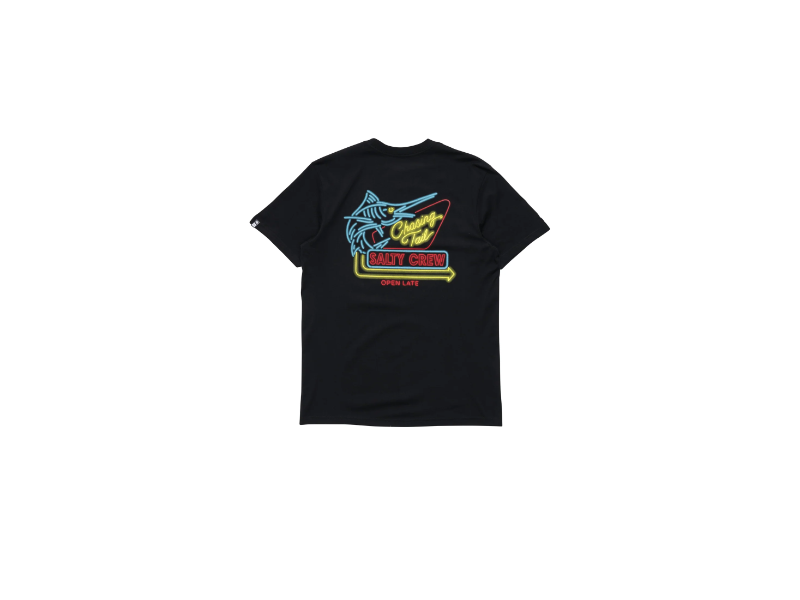 The Neon Sign Premium SS Tee in Black is made from 160gsm ring-spun Cotton Jersey. It features digitally printed graphics on the front and back, and a Salty Crew clamp label at the sleeve hem.