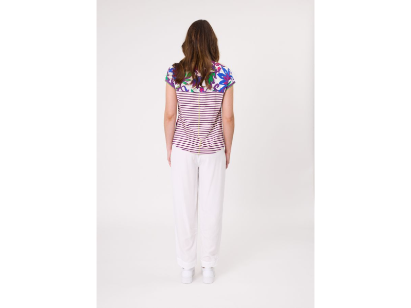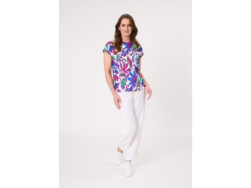 • Bold floral print in shades of blue, green, purple, and cerise.