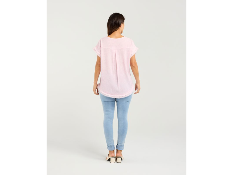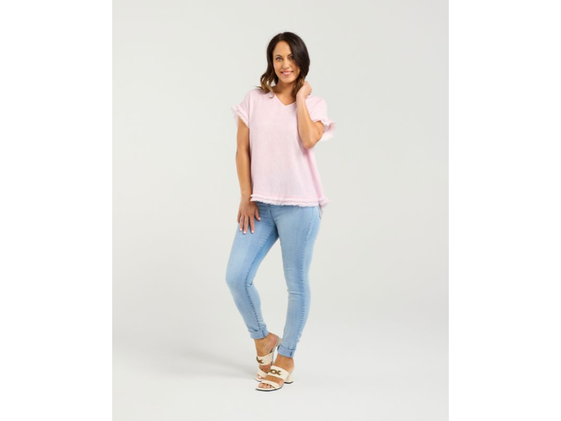 This soft pink V-neck top blends simplicity with subtle texture. Short sleeves and a gently relaxed fit make it an easy everyday piece, while frayed detailing on the cuffs and hem adds a lived-in, romantic edge. The raw finishes give it a casual elegance, perfect for layering or wearing solo on breezy days.