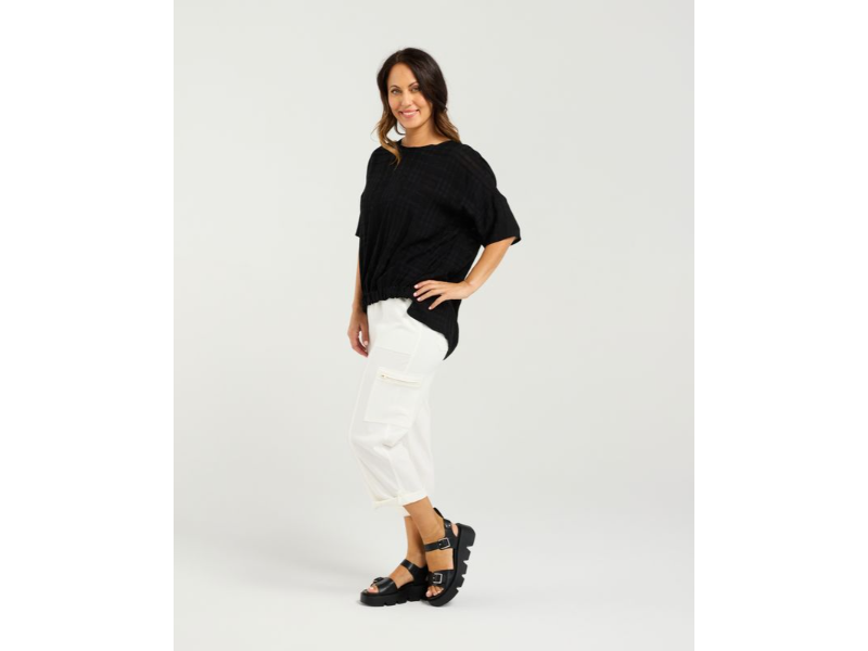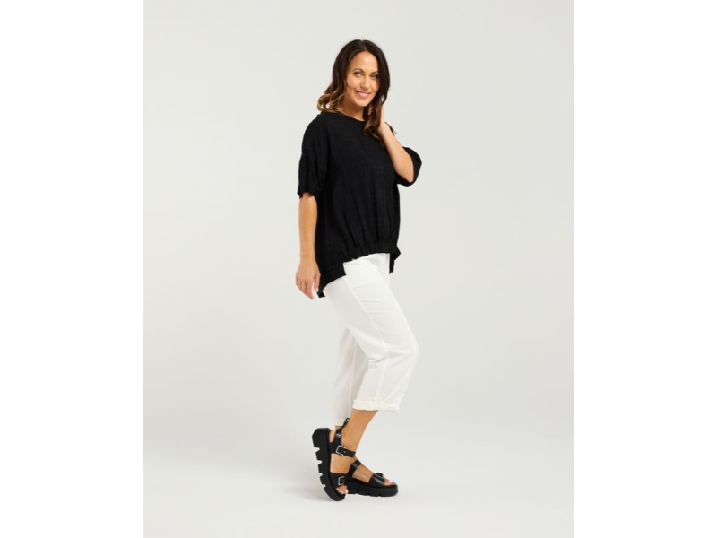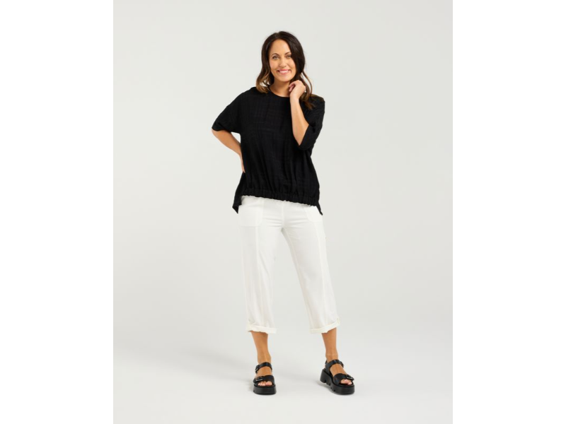 Our timeless top with a gathered front waistband and slightly longer finish in the back with a subtle plaid as an added detail.