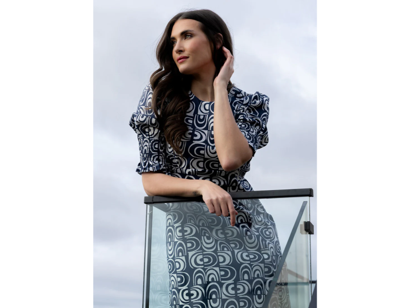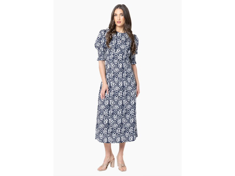 A Empire waist enhances the fluid fit of this figure-skimming midi made with a retro print and framed by puff sleeves.