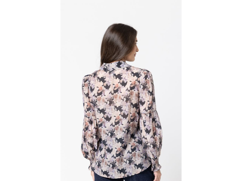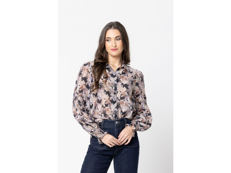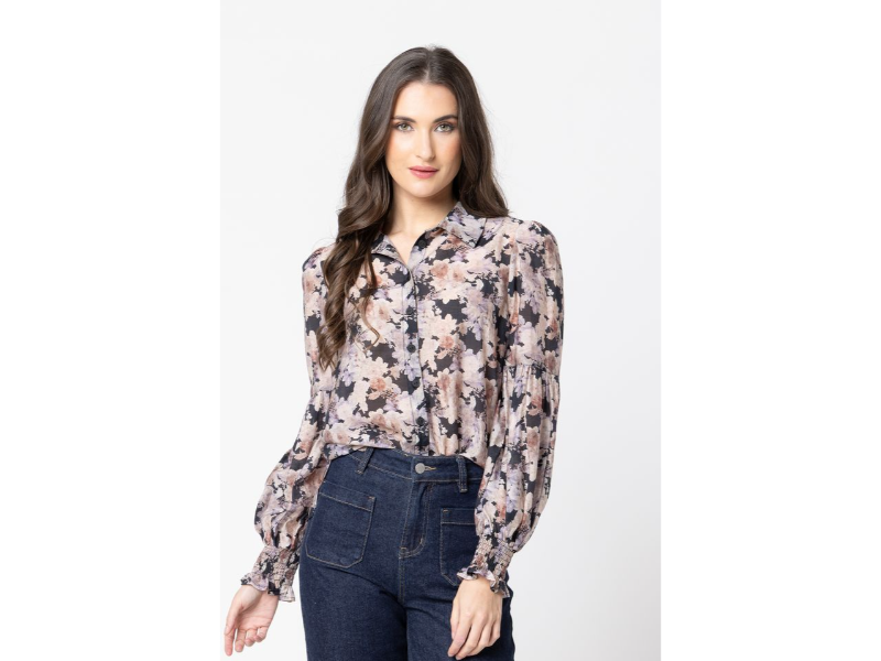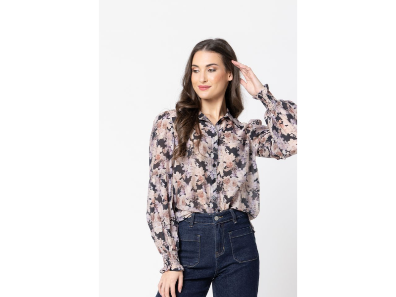 COLLARED BUTTON UP SHIRT – SHEER VISCOSE AND NYLON WITH TAN CREAM AND LAVENDER PRINT. LONG SLEEVE ELASTICATED CUFF BLOUSEY SLEEVES WITH A TAIL. PERFECT TOP TO TAKE YOU ANYWHERE WITH A TOUCH OF POWER.