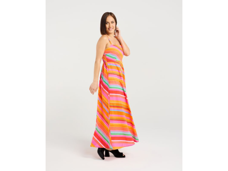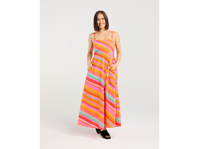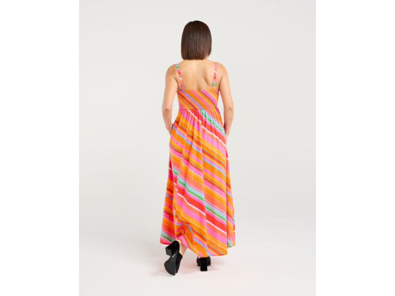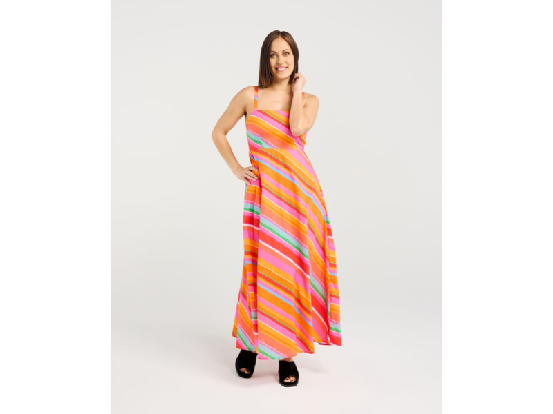 A bold beauty for sunny days, this strappy summer dress features a fitted bust with elastic at the back for a comfortable, flexible fit. The flared skirt adds movement to the simple, elegant silhouette, all brought to life in vibrant, colorful fabric.
