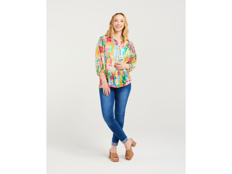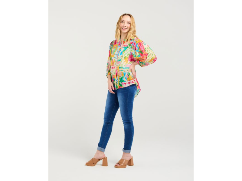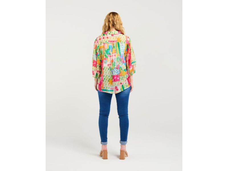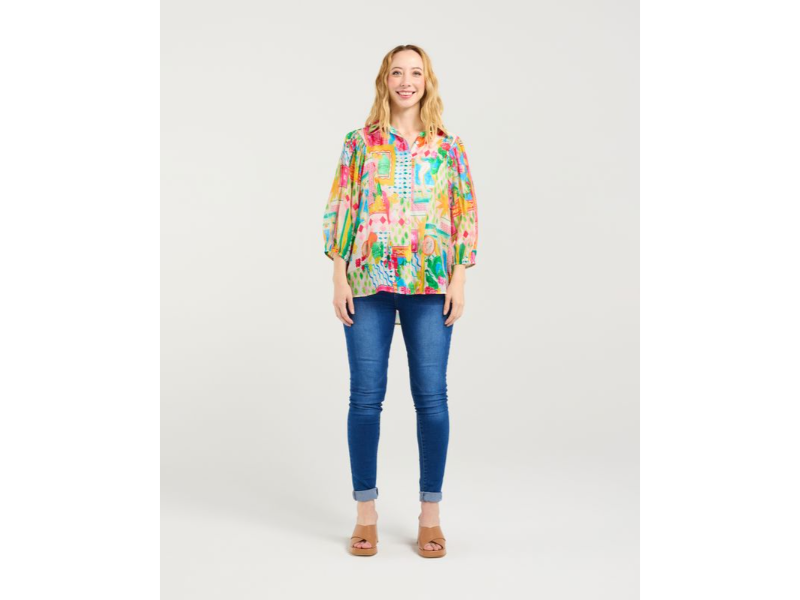 This shirt features a bold-look colourful fabric with a button-down collar neckline and elasticated puff sleeves that reach the elbow, combining classic charm with a touch of modern comfort.